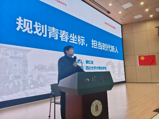 11月8日下午,四川大学计算机学院在江安校区水上报告厅开展团校开学典礼暨第一次行课。本次团校以“规划青春坐标,担当时代新人”为主题,由学院党委副书记黎红友副教授授课,学院2025级全体学生参与学习。