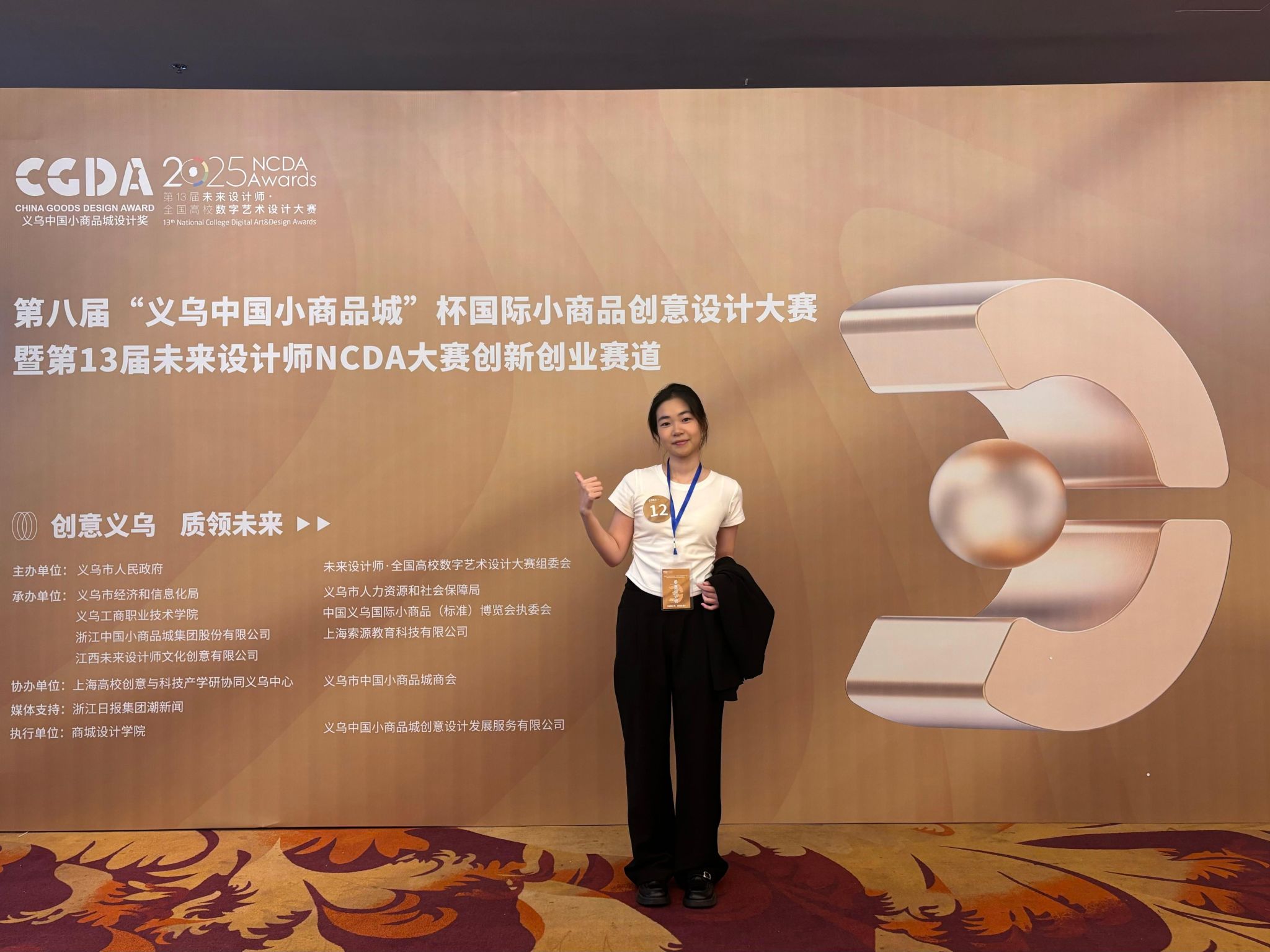 (邱佳瑜)10月21日,艺术与设计学院环境设计2401班邱佳瑜在2025第十三届未来设计师全国高校数字艺术设计大赛(NCDA)创新创业赛道全国总决赛中,荣获全国二等奖。本届创新创业赛道自2024年11月启动以来,以“创意义乌 质领未来”为主题,在全国分设东南西北中五大赛区,共征集到原创设计作品5627件,覆盖全国472所高校,竞争非常激烈。在院系领导的关怀和指示下,本科生邱佳瑜与杨思原的作品入围国赛,并凭借卓越表现在全国众多优秀作品中脱颖而出。