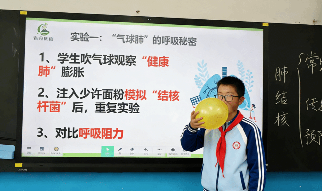 趣味科普课堂中,成员们精心设计“气球肺呼吸秘密”实验,让学生直观感受结核病对呼吸的影响。实验中,学生们先轻松吹起代表“健康肺”的气球,再往气球内注入面粉模拟“结核杆菌”。感受到呼吸阻力时同学们纷纷皱起眉头:“像有团棉花堵在喉咙里!”。简单的对比实验让大家在亲身体验中牢记科学预防结核病的重要性。